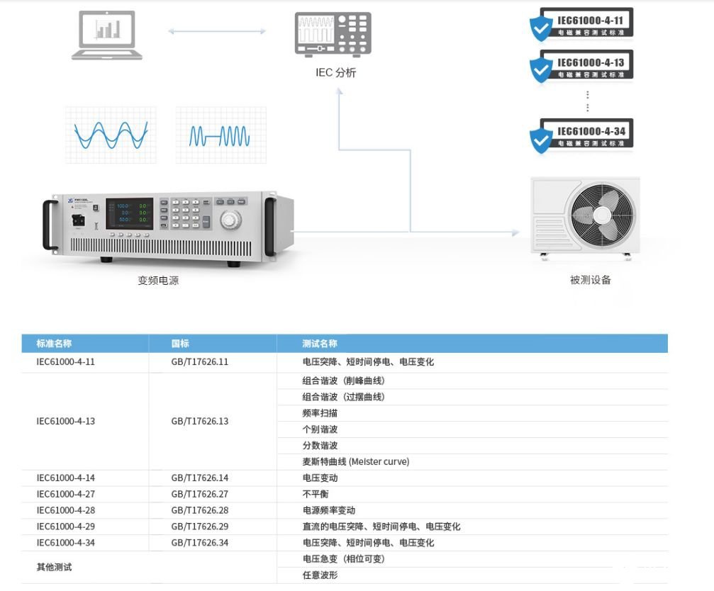 在實際的供電環(huán)境中,主要是因為電網(wǎng)、電力設(shè)施的故障或負荷突然出現(xiàn)較大變化會導(dǎo)致供電電壓出現(xiàn)暫降甚至短時中斷,這樣的因素都會對采用交流供電的設(shè)備工作產(chǎn)生影響。這就要求交流電源能按照IEC61000-4中的相關(guān)標(biāo)準對設(shè)備進行測試,以保證設(shè)備在供電異常情況下還能正常運行或者恢復(fù)。