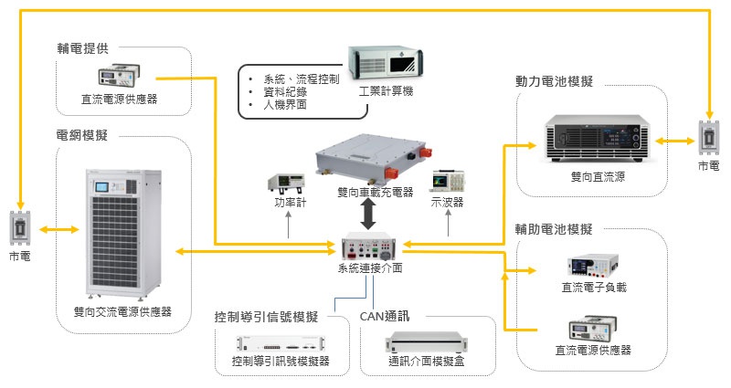 針對電動車車載充電器(OBC)測試,Chroma測試方案已廣泛應用汽車製造商、零部件廠與質檢單位等,提供符合QCT/895測試要求與客製化服務。因應BOBC的技術發(fā)展,Chroma搶先佈局於現(xiàn)有測試基礎上加入新一代能源回收式電網(wǎng)模擬電源與雙向直流電源供應器,提供電網(wǎng)及動力電池模擬,並透過雙向I/O介面及系統(tǒng)整合,全面涵蓋待測物的應用場景。