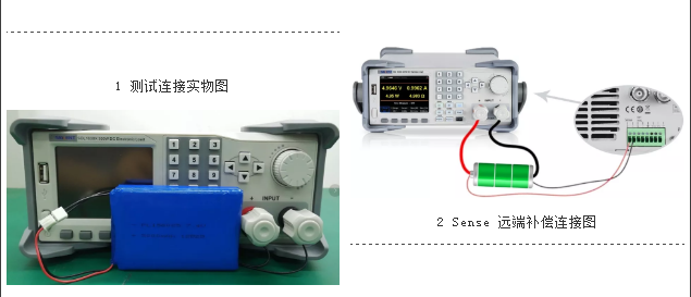 C、當(dāng)大電流(比如大于5A)且線纜又比較長時(shí),必須要考慮線損。因?yàn)閷?dǎo)線存在阻抗,在大電流下,會產(chǎn)生壓降從而導(dǎo)致負(fù)載測量的電壓偏低。為了消除這種誤差,必須要使用電子負(fù)載的遠(yuǎn)端補(bǔ)償功能(Sense功能)來消除電壓誤差,如下圖2所示,遠(yuǎn)端補(bǔ)償功能的原理是Sense端子直接檢測被測設(shè)備的輸出端,當(dāng)線損電壓不可忽略時(shí),自動(dòng)補(bǔ)償線損壓降,保證被測設(shè)備輸出電壓與負(fù)載所獲得的輸入電壓一致)。此次測試的電池額定電流為2A且測試線纜只有20cm,故無需使用遠(yuǎn)端補(bǔ)償功能。