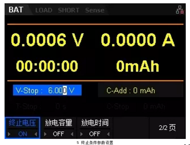 C、終止條件參數(shù)設(shè)置。在電池測試界面的2/2頁,可以設(shè)置“終止電壓”、“放電容量”和“放電時(shí)間”。由于此次測試只測試終止電壓這單一測試條件,終止電壓為6V(根據(jù)電池規(guī)格書,低于6V電池將無法正常供電)因此“放電容量”和“放電時(shí)間”均設(shè)置為“OFF”;如圖5。