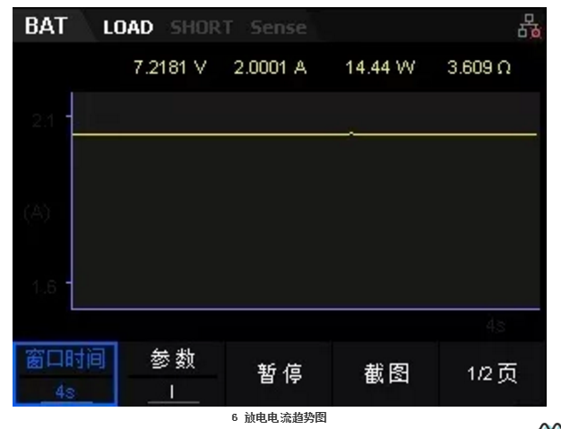 1.3.2趨勢圖顯示在測試過程中,我們可以按下前面板的Display按鍵,進(jìn)入趨勢圖界面,查看被測信號的趨勢,如圖6所示。電子負(fù)載顯示的是實(shí)測電流隨時(shí)間的變化趨勢。再次按下Display,則退出波形顯示界面,并返回電池測試功能的主界面。