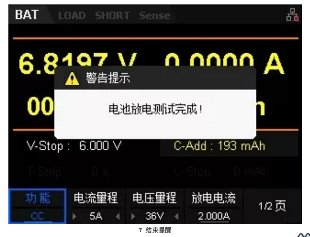 在SDL1030X持續(xù)的消耗電能過程中,電池的電壓將會緩慢下降,當(dāng)電壓降至設(shè)置的6V電壓后,電子負(fù)載將停止拉載并結(jié)束測試,彈出“電池放電測試完成!”的提示框。如圖7所示。
