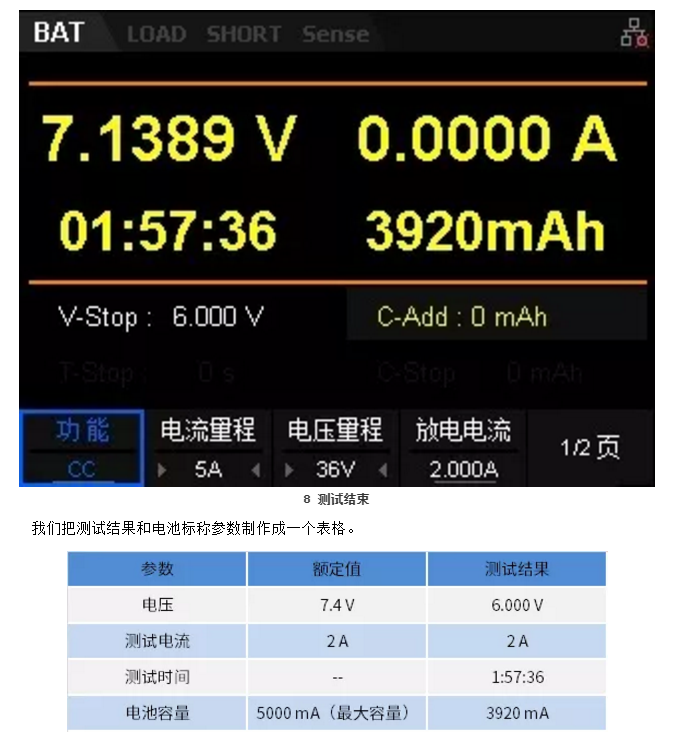 從表格上看,此次測試的電池在2A電流下持續(xù)放電,電壓下降到6V時(shí),耗時(shí)1小時(shí)57分36秒。容量為3920mA。經(jīng)計(jì)算此塊電池容量為大容量的78.4%下圖8為測試結(jié)束后的截圖。從圖中可以看到,在負(fù)載拉載后電池空載,電壓反而又升級到了7.1389V,但此時(shí)的電池已經(jīng)沒有負(fù)載能力。