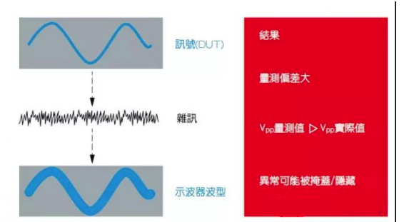 如果信號強度低于示波器和探棒/纜線系統(tǒng)的噪聲,你永遠也測量不出該信號。信號在進入示波器后、進入模擬數(shù)字轉換器(ADC)前,會迭加前端噪聲;然后每個儲存的樣本除了包含原始的信號值,也會存在一些偏移量(offset),偏移量大小取決于獲取樣本時存在的噪聲大小。使用者將在示波器的顯示屏上看到較粗波形,不要將它與快速更新速率相混淆。高于真實信號的峰-峰值會顯示并被測量到。
