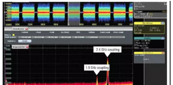 但要找出并隔離電源軌上的耦合信號(比如本例中的2.4GHzWi-Fi信號),則需要采用頻域圖。