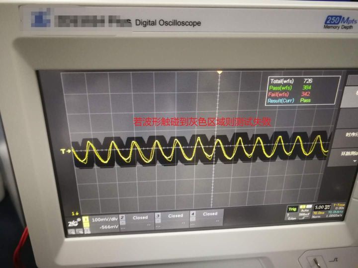 上圖是模板測試的界面,若馬達(dá)工作時波形無規(guī)律,波形幅度變化大,波形就會觸碰到灰色區(qū)域,測試就會失敗,同一時間數(shù)字示波器通過外部觸發(fā)輸出一個脈沖信號,我們通過BNC線纜把數(shù)字示波器輸出的脈沖信號接到PLC控制器就可以實(shí)現(xiàn)自動測試,把不良的馬達(dá)分離出來,我們還可以設(shè)置讓數(shù)字示波器發(fā)出聲,也可以截圖保存。