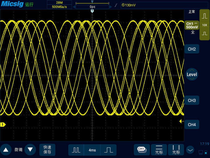 數(shù)字示波器的時基是4ms,代表屏幕橫坐標(biāo)上波形走過一格是4ms的時間,數(shù)字示波器橫坐標(biāo)一共有14格,那么一屏幕就是56ms的波形。