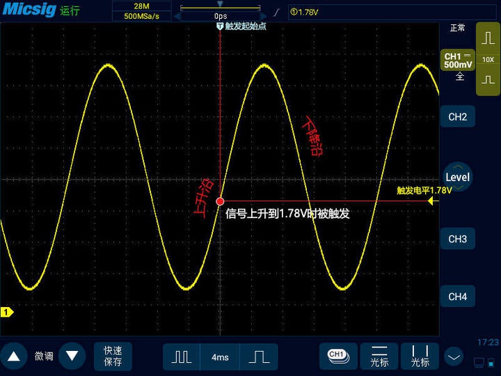 想要波形每次都一樣,那么就是要找到波形重復(fù)的規(guī)律,我們繼續(xù)觀察這個正弦波,這是一個周期性變化的正弦波,它的每個周期都有一個上升沿和下降沿,如果我們讓數(shù)字示波器每次都從上升沿開始捕捉那就可以重復(fù)了嗎?