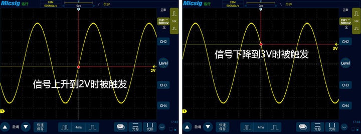 上述所說這種尋找重復(fù)波形的思路是數(shù)字示波器中最常見的也是最常用的觸發(fā)思路,叫做邊沿觸發(fā)。通過調(diào)節(jié)上升邊沿或者下降邊沿,來定義數(shù)字示波器觸發(fā)起始點捕獲的是上升中的波形還是下降中的波形。