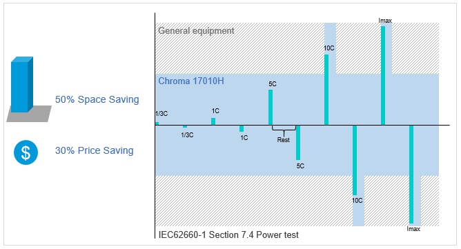 參考國(guó)際標(biāo)準(zhǔn)IEC62660-1實(shí)施功率測(cè)試,電池芯以10秒脈沖電流測(cè)量結(jié)束時(shí)的電壓來計(jì)算功率特性,脈沖電流依規(guī)則逐步增大倍率直到制造商定義的最大電流能力,據(jù)此60Ah鋰電池芯若要測(cè)試10倍脈沖工作電流(10C-rate),在過去必須購置600A充放電設(shè)備才能實(shí)施?,F(xiàn)在,致茂電子提供兩倍的電流測(cè)試方案供您選擇!