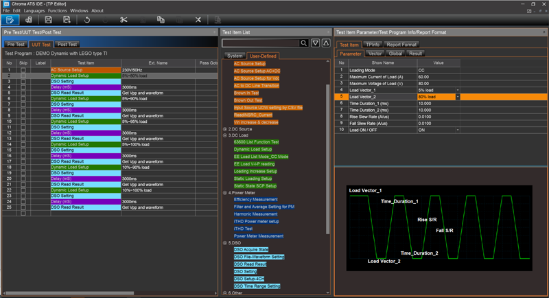 為了讓撰寫Chroma 8000測(cè)試程序變得更加容易上手,致茂將儀器的單一功能與參數(shù)設(shè)定的測(cè)試命令(Test Command;TC)集合成積木式測(cè)試項(xiàng)目(Test Item;TI)的測(cè)試程序編輯方式,將電源開發(fā)上常見的設(shè)備,如:交/直流電源、數(shù)字電表、電子負(fù)載、示波器等,提供每臺(tái)設(shè)備會(huì)使用到的積木式TI,完整具備儀器的單一功能與參數(shù)設(shè)定,使用者僅須依照需要的儀控測(cè)試流程來自行編輯測(cè)試程序(Test Program,TP),最后在每個(gè)儀控積木式TI設(shè)定測(cè)試條件與規(guī)格后,就可以立即執(zhí)行自動(dòng)化測(cè)試。