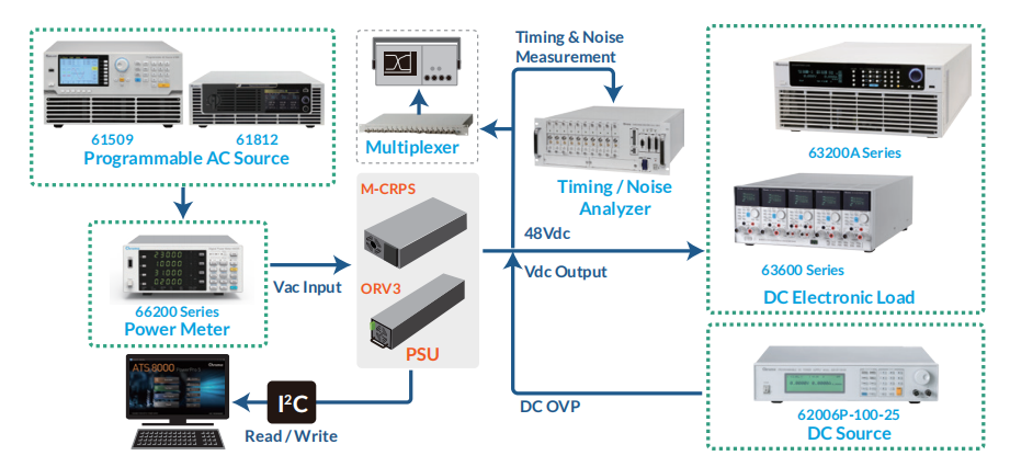 服務(wù)器的穩(wěn)定運(yùn)行仰賴高效能與高可靠度的電源供應(yīng)器(PSU)。其核心功能是將來(lái)自電網(wǎng)的交流電(AC)轉(zhuǎn)換為服務(wù)器運(yùn)作所需的24V/48V直流電(DC)。依據(jù)M-CRPS、OCP ORV3測(cè)試指南,Chroma直流電子負(fù)載63200A系列可滿足測(cè)試PSU規(guī)格與性能的要求。尤其針對(duì)測(cè)試PSU的瞬間功率及動(dòng)態(tài)電流,電子負(fù)載63200A的高速動(dòng)態(tài)特性更是適合。Chroma針對(duì)服務(wù)器電源PSU提供完整的測(cè)試方案,透過(guò)自動(dòng)化測(cè)試流程與編程測(cè)試項(xiàng)目,驗(yàn)證PSU在實(shí)際應(yīng)用中的性能與可靠度,確保其滿足高標(biāo)準(zhǔn)的運(yùn)行需求。相關(guān)測(cè)試設(shè)備與系統(tǒng)架構(gòu)建議如下: