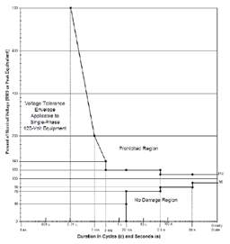 ITIC曲線描述了服務(wù)器電源在面對(duì)電壓異常(包括穩(wěn)態(tài)和瞬時(shí)條件)時(shí)的耐受能力。大多數(shù)ITIC測(cè)試條件(如黃色和綠色區(qū)域的測(cè)試點(diǎn))對(duì)于測(cè)試設(shè)備來(lái)說(shuō)相對(duì)容易達(dá)成,然而,紅色區(qū)域中的500%電壓突波測(cè)試是極具挑戰(zhàn)性的。Chroma 61800-100實(shí)現(xiàn)了峰值電壓過(guò)1.9kV (277Vacx5 x1.414) 并維持了200微秒。