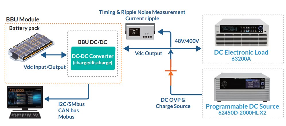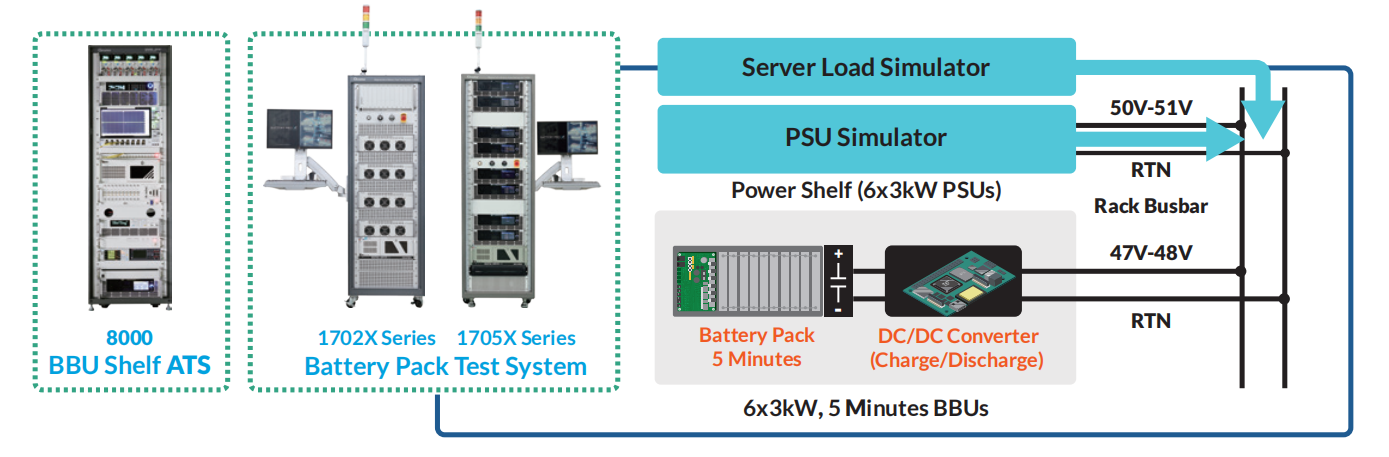 BBU (Backup Battery Unit) 是服務(wù)器系統(tǒng)重要的電源備援設(shè)備,當主電源停機時可立即提供短暫電力,將正在進行的數(shù)據(jù)做儲存。BBU主要由電池、電池管理系統(tǒng)(BMS)及雙向直流電源模塊所組成,其中直流電源模塊負責將電池轉(zhuǎn)換為服務(wù)器所需的穩(wěn)定電壓,確保服務(wù)器持續(xù)運行。在不同的電源構(gòu)架下,BBU有低壓48V及高壓400V/800V的總類。電子負載進行充放電效率測試及功率穩(wěn)定性評價,并模擬實際供電條件以驗證模塊啟動與充電性能,提供精準的測試數(shù)據(jù),全面評價BBU的性能,確保其在服務(wù)器中的穩(wěn)定運行。