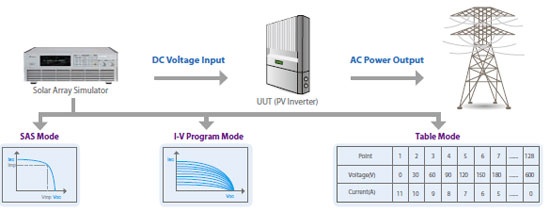 Chroma62150H-1000S具有響應(yīng)快、可控制、重復(fù)性、高穩(wěn)定性及模擬I-V曲線直流電源,于單機(jī)內(nèi)建EN50530 & Sandia的SAS模型可簡(jiǎn)單且方 便設(shè)定Voc、Isc、Vmp及Imp等參數(shù)后產(chǎn)生一I-V曲線輸出,另外具有I-V Program功能可儲(chǔ)存100條不同照度及溫度下的I-V曲線于記憶體內(nèi),并且可 以設(shè)定每一條I-V曲線執(zhí)行時(shí)間(1-15,000S),此外也提供一Table模式允許使用者透過數(shù)位介面存入128~4096點(diǎn)的V&I 陣列功能,可讓使用者編輯任 何遮罩的I-V曲線,以上非常適合驗(yàn)證光伏逆變器(PV Inverter)如下性能: