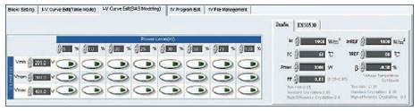于此Softpanel內(nèi)建一Sandia及EN50530的Photovoltaic I-V Curve Model,此可方便使用者只需輸入欲測(cè)試PV Inverter的輸入功率值(Pmax)、 Fill Factor、Vmin、Vnom及Vmax值,然后使用者可直接按要測(cè)試的功率百分比值(5%、10%、20%、25%、30%、50%、75%、99.9%),此Softpanel可自動(dòng)地產(chǎn)生此測(cè)試的太陽電池I-V曲線,接著直接按下載至單機(jī)后開始模擬此I-V曲線予PV Inverter測(cè)試Conversion Efficiency。