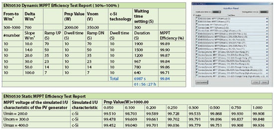 因動(dòng)態(tài)功率點(diǎn)追蹤效能也會(huì)影響逆變器對(duì)光伏發(fā)電系統(tǒng)所發(fā)電能的有效利用及長(zhǎng)期效益,因此法規(guī)EN50530 & Sandia & CGC /GF004訂定一標(biāo)準(zhǔn)動(dòng)態(tài)功率點(diǎn)跟蹤效能測(cè)試程序,此可讓逆變器設(shè)計(jì)廠家對(duì)于功率點(diǎn)追蹤演算效能得到一測(cè)試及提升。使用者可藉由SoftPanel內(nèi)建EN50530 & Sandia & CGC/GF004的Dynamic MPPT測(cè)試程序選取欲測(cè)試項(xiàng)目,此可簡(jiǎn)單地測(cè)試逆變器于研發(fā)及品保階段,當(dāng)測(cè)試執(zhí)行過程中可即時(shí)地計(jì)算Energy及MPPT EFF%,并且可將測(cè)試追蹤過程的讀值記錄下。