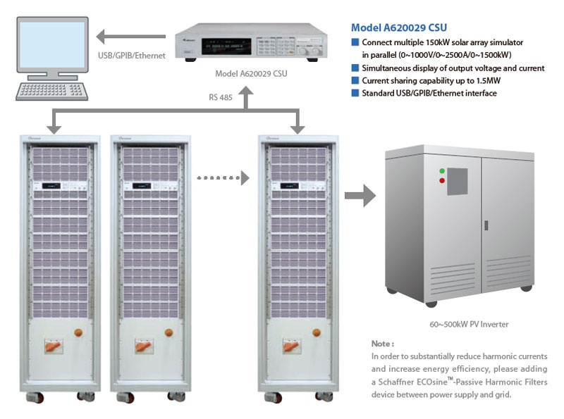 當(dāng)需要高功率I-V模擬電源商業(yè)及發(fā)電站用光伏逆變器測(cè)試時(shí),一般以并聯(lián)方式連接二臺(tái)或多臺(tái)電源供應(yīng)器。62150H-1000S系列電源供應(yīng)器具有主/從智能并聯(lián)控制模式達(dá)10臺(tái)150kW,使并聯(lián)操作模式快速又簡(jiǎn)易如同一單機(jī)(Stand-Alone)。在此模式中,主單機(jī)(Master)設(shè)定數(shù)值自動(dòng)下載資料到 從屬(Slave)單機(jī),且具有高速同步訊號(hào)控制處理及系統(tǒng)自動(dòng)均流控制。