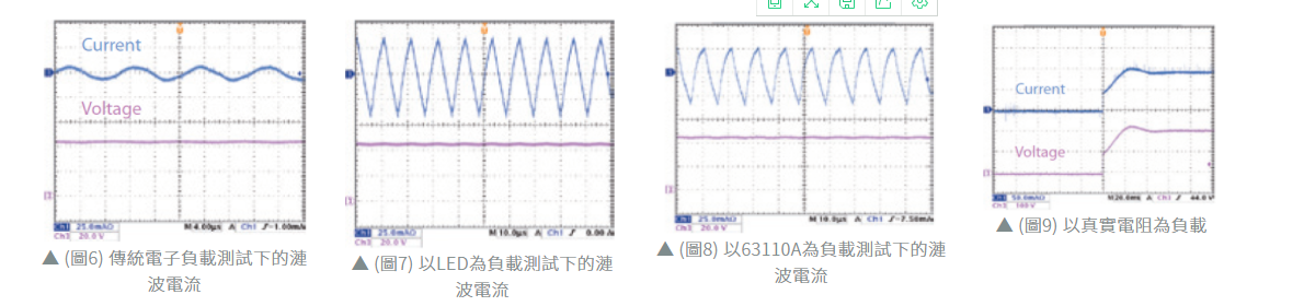 圖9是以真實(shí)電阻為負(fù)載的拉載電流波形(藍(lán)色);