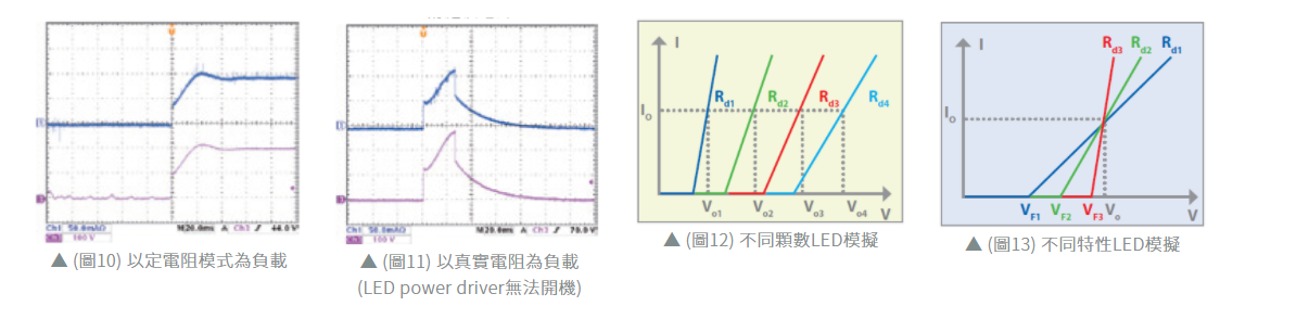 圖9與圖10的電流與LED為負(fù)載的電流波形有相當(dāng)大差異,且電流及電壓都有過沖的情況發(fā)生,易導(dǎo)致LED driver在開機(jī)時發(fā)生過電壓或過電流保護(hù)。