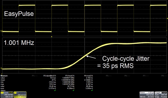 DDS 方法輸出方波/脈沖時, 如果采樣率和輸出頻率不成整數(shù)倍關(guān)系,將產(chǎn)生一個采樣周期的抖動。采用 EasyPulse 技術(shù)可克服這個缺陷;產(chǎn)生低抖動的方波和脈沖信號,此外還具有以下優(yōu)勢: