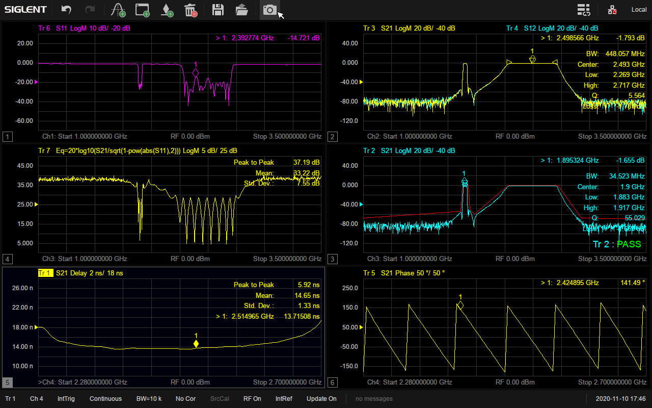SNA5000X系列支持在多個窗口添加多條跡線進(jìn)行全4端口S參數(shù)測試,并且具備多種顯示格式,比如 Log Mag,Lin Mag,Phase,Delay,Smith,SWR,Polar等,可以方便快捷地分析被測物的傳輸系數(shù),反射系數(shù),駐波比,阻抗匹配,相位,延時等參數(shù)。在生產(chǎn)線驗證天線,濾波器等的特性時,還可以保存參考跡線或者添加Limit模板進(jìn)行通過失敗測試,有利于提高生產(chǎn)效率。