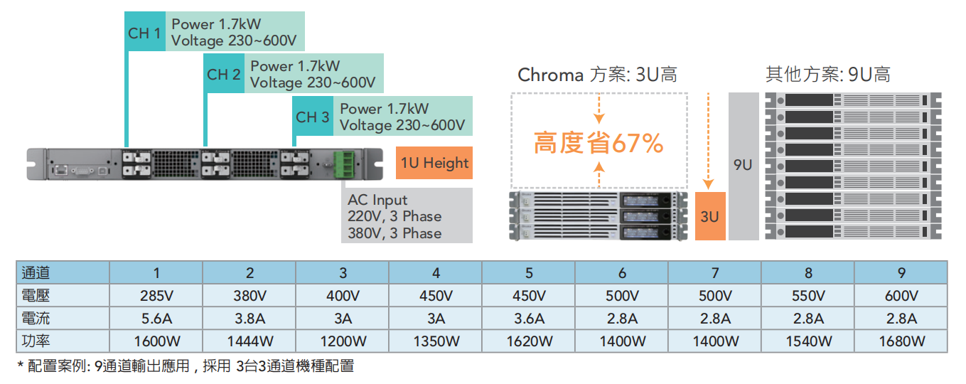 采用高功率密度之電源設計實現(xiàn)1U機框內(nèi)可3信道1.7kW輸出,各別通道具隔離設計可獨立電壓/電流控制及測量,此可節(jié)省系統(tǒng)整合柜體之空間配置及簡化配線,舉例應用:以下原為系統(tǒng)整合制造商于設備上所需的9臺直流電源供應器規(guī)格,相較于其它方案須9臺單通道電源,配置高度9U;使用62000E系列電源進行規(guī)劃僅需3臺,高度總和3U即可符合(規(guī)劃使用3信道機種)。