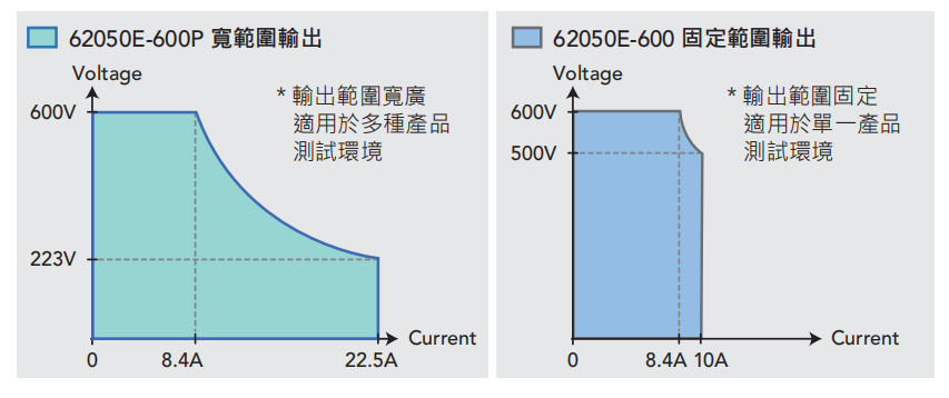 62000E系列具有兩款電源-寬范圍(Auto-range Output)電源及固定范圍(Fixed-range Output)電源,可供使用者依應用、規(guī)格及預算進行選購。例如,62050E-600P為寬范圍電源設計,輸出規(guī)格為5kW/600V/22.5A,可于不同的組合中靈活操作(如圖所示),于低輸出電壓223V時提供較大的電流22.5A,反之于高壓600V時提供較小的電流8.4A,這表示低電壓/高電流及高電壓/低電流兩者需涵蓋的待測物可選擇寬范圍直流電源供應器,適合使用于Test & Measurement的自動測試系統(tǒng)(ATE),以取代多臺直流電源供應器,節(jié)省成本與空間。