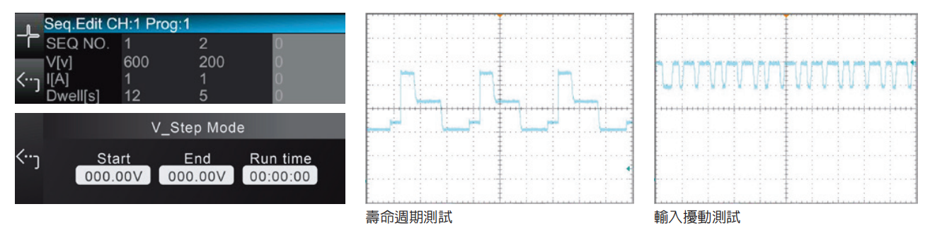 62000E系列直流電源具有100步的可編程步驟設定,使用者可透過List Mode自定義編輯所需輸出波形,停留時間(Dwell Time)10ms-65535s控制,可滿足許多測試需求,應用的范圍包括DC/DC轉(zhuǎn)換器和逆變器的壓降測試、零組件產(chǎn)品壽命周期測試及飛機航空測試等等。