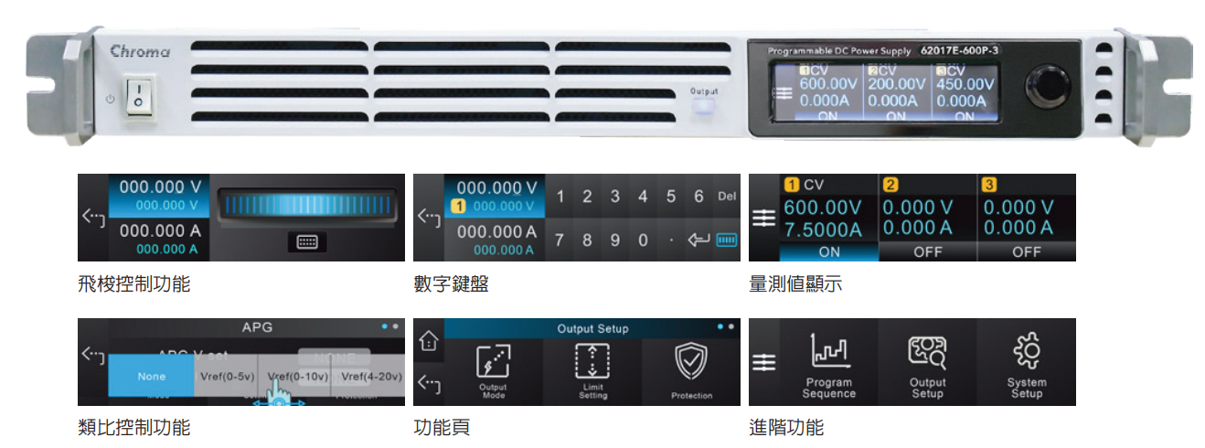 Chroma 62000E系列可程控直流電源供應器提供1U機框內(nèi)含單通道1.7kW、3.4kW、5kW及三信道1.7kW,為采用高功率密度之電源設計,具有固定范圍(Fixed-range Output)電源及寬范圍(Auto-range Output)電源兩款共28個不同的機型,輸出電流范圍可達22.5A,電壓范圍至1200V。
