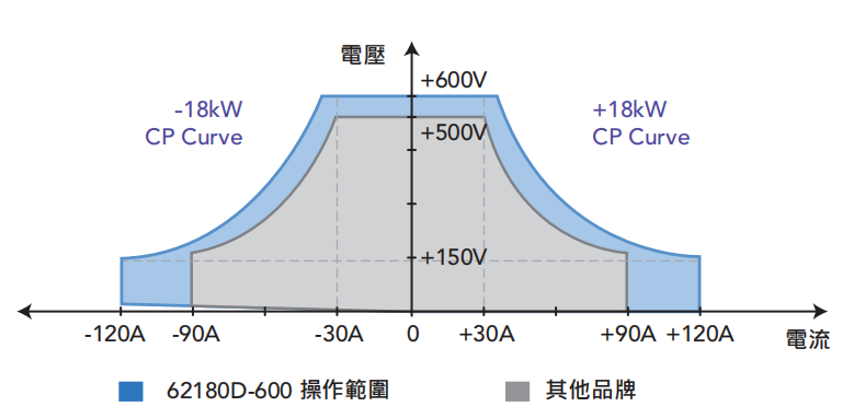 62000D雙向直流電源提供寬廣的4倍操作范圍。型號(hào)62180D-600的輸出規(guī)格為18kW/600V/120A可于不同的組合中靈活操作如圖所示。相較競(jìng)爭(zhēng)者直流電源的輸出范圍為3倍,62000D于低電壓時(shí)提供較大的電流。這表示低電壓/高電流及高電壓/低電流兩者的待測(cè)物可使用此單臺(tái)直流電源供應(yīng)器測(cè)試涵蓋更廣,于一般的ATE系統(tǒng)及實(shí)驗(yàn)桌使用時(shí)可取代多臺(tái)直流電源供應(yīng)器以節(jié)省成本與空間。