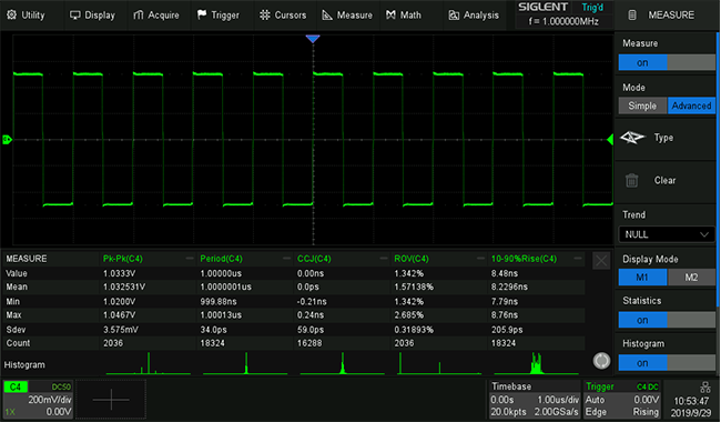 數(shù)十種自動(dòng)測(cè)量功能,支持測(cè)量統(tǒng)計(jì)、Gating 測(cè)量、Math測(cè)量、History 測(cè)量、Ref 測(cè)量。支持對(duì)測(cè)量參數(shù)的直方圖和趨勢(shì)圖統(tǒng)計(jì)