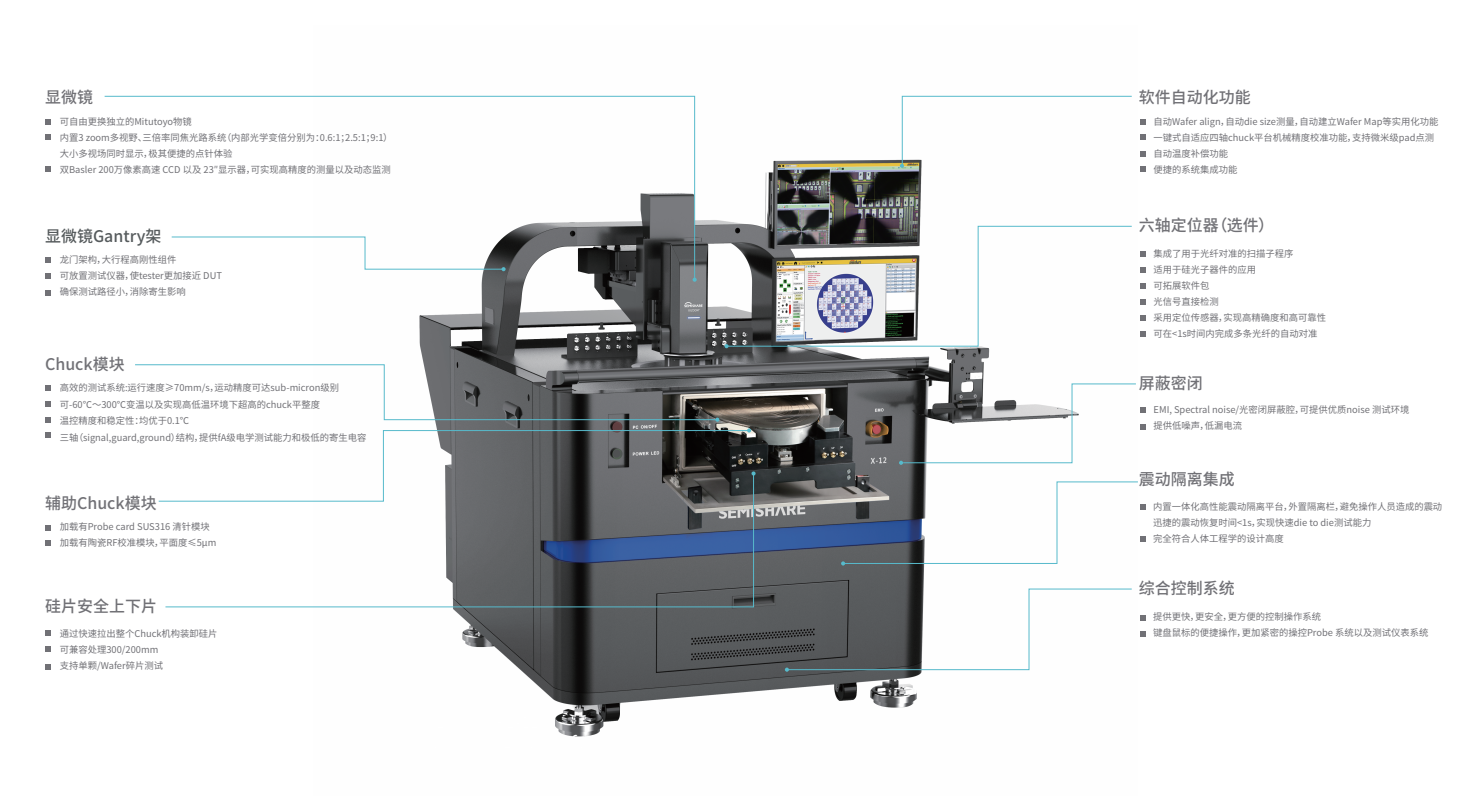 探針測試系統(tǒng)采用O型的針座平臺設計,使針座的空間擺放面積達到了高效的利用,有效實現(xiàn)更高效快速的測試。