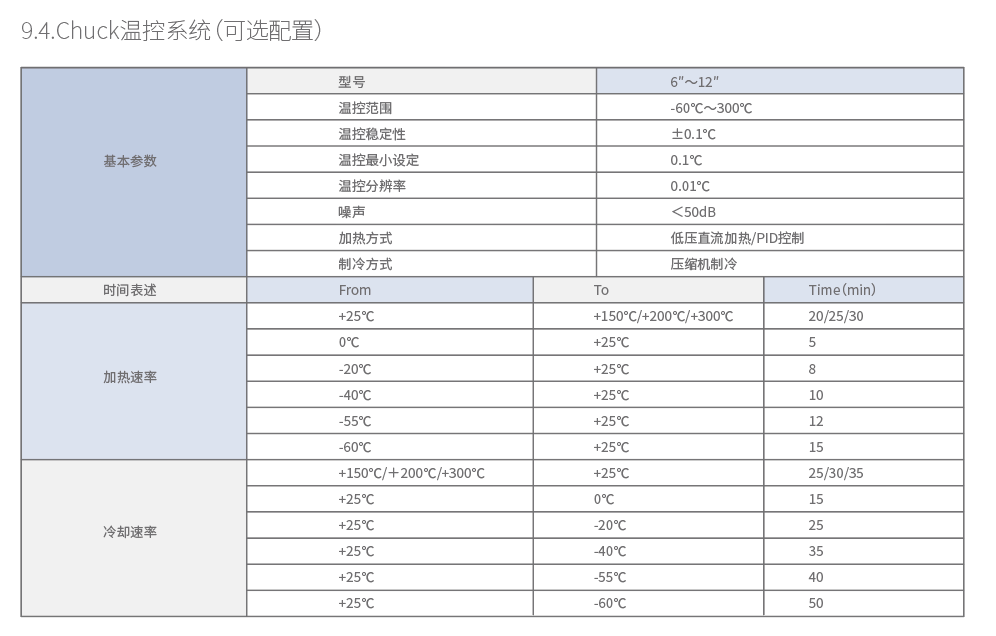 ● 高效的CHUCK測試系統(tǒng)運行速度≥70mm/s,運動精度≤1μm,同時移動轉位時間index time≤500ms,優(yōu)異的系統(tǒng)運行參數(shù)已達到領先水平,高測試精度和效率滿足各類晶圓和器件的高重復性與穩(wěn)定性測試測試效率有效提升40%以上;●優(yōu)于± 0.08℃的溫控精度和穩(wěn)定性,提供高低溫環(huán)境下的可靠性晶圓測試;●四維運動低重心緊湊結構設計,確保70mm/s的運動速率的同時保持運動加減速的穩(wěn)定性。
