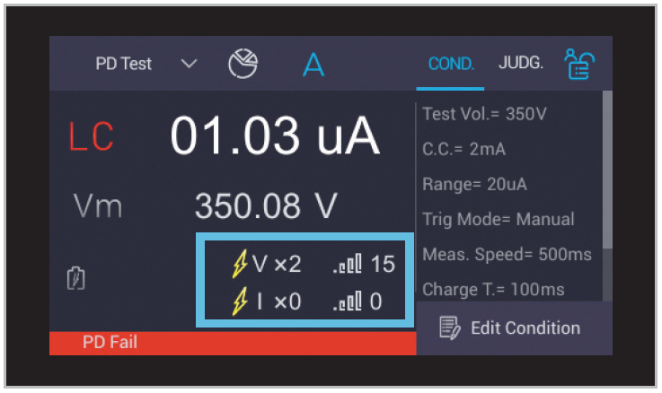 Chroma 11210使用特殊電路設(shè)計(jì)提供PD偵測(cè)功能,全程監(jiān)測(cè)測(cè)試過程中電芯內(nèi)是否曾經(jīng)發(fā)生過因局部異常放電而產(chǎn)生的異常電氣閃絡(luò)并量化為可視程度并同時(shí)記錄波形。在達(dá)到測(cè)試電位后,測(cè)試時(shí)間內(nèi)也會(huì)與一般耐壓或絕緣測(cè)試器一樣進(jìn)行漏電流或絕緣電阻值測(cè)量判定異常。+瞬時(shí)高壓測(cè)試(+Flash)功能提供兩階段間斷式高低電壓,分別檢測(cè)待測(cè)物在高壓時(shí)耐壓特性以及低壓下漏電流表現(xiàn),獨(dú)立的判定漏電流大小以及PD檢出功能,可以有效作用于各種儲(chǔ)能元件。